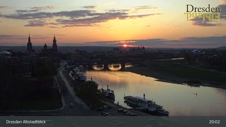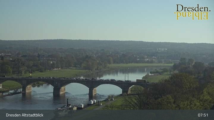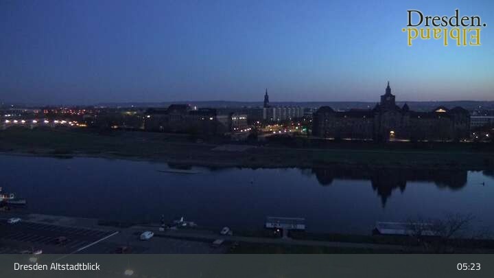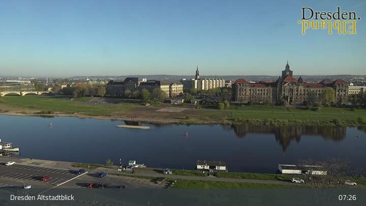 Die Kamera befindet sich am Hotel am Terrassenufer in Dresden und blickt auf die Altstadt und die Elbe.